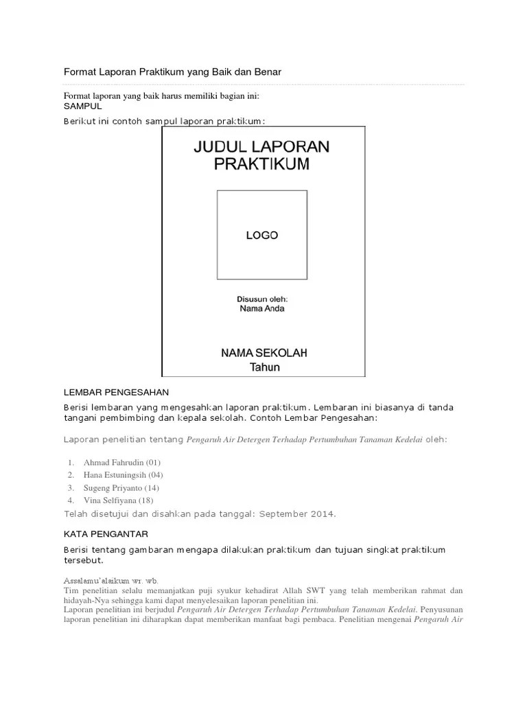 Pelaksanaan praktikum dari awal sampai akhir, serta pembahasan hasil. Setiap bab dalam tubuh laporan dibuat format standar yang memuat uraian pembahasan kegiatan setiap pertemuan pelaksanaan praktikum dari awal sampai akhir, . Jadi sebaiknya dalam membuat laporan dibiasakan . Penulisan laporan praktikum merupakan salah satu kegiatan dalam mata. Menulis laporan praktikum biologi, sebenarnya merupakan dasar berlatih menulis laporan penelitian.